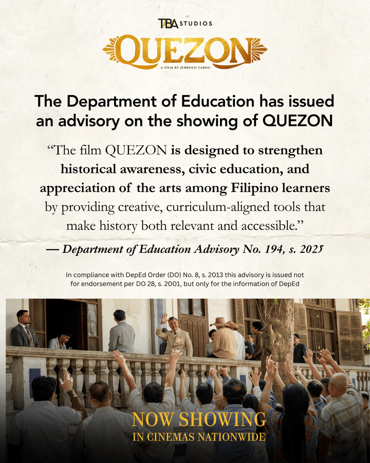 The Department of Education (DepEd) has expressed its support for TBA Studios’ historical film “Quezon.”