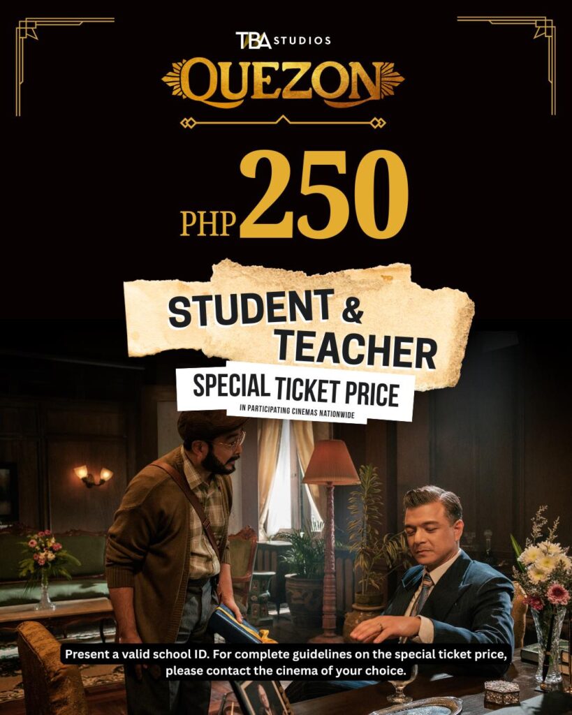 Starting October 15, teachers and students can enjoy a special ticket rate of only ₱250! Just present your school ID at the ticket counter of your favorite cinema to watch QUEZON in theaters!